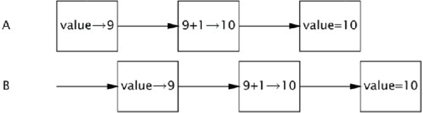 value++看似是一个操作,但实际上会被编译成三个操作:读值、改值、写值。如果某一时刻两个线程 A 和 B 读到了相同的 value,那么它们